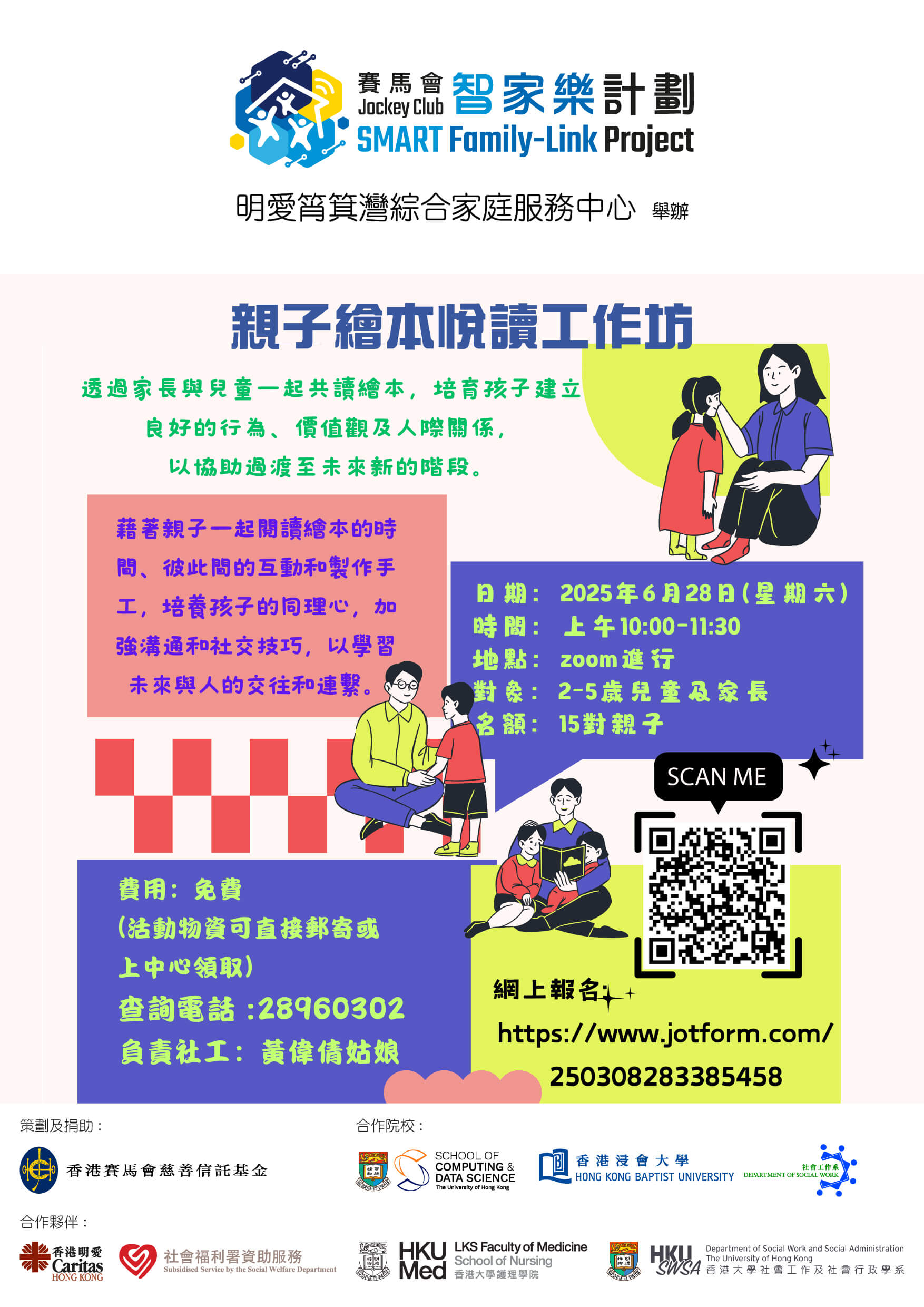 親子伴讀不但可以讓孩子養成閱讀嘅好習慣,仲能夠增強孩子創意力,促進親子關係。活動會透過親子閱讀繪本,互動同製作手工,加強子女嘅溝通同社交技巧,以學習未來與人交往同連繫。